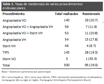 Hubo un alto éxito técnico general (96%) con 2.8% de eventos adversos mayores. Después de 1 mes, se observó una respuesta completa en 383 pacientes (84,7%), una respuesta parcial en 54 pacientes (12%) y ninguna respuesta en 15 pacientes (3,3%). Hubo una tasa de reestenosis del 19% después de una intervención endovascular inicial exitosa, de las cuales el 86% se trató con éxito. Las probabilidades de supervivencia a 1 y 5 años en los grupos de recanalización y TIPS fueron 96% y 89%, y 90% y 76%, respectivamente.
