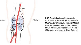 La osteoartritis sintomática (OA) de la rodilla es una de las principales causas de discapacidad. Uno de los posibles tratamientos para aliviar la sintomatología es la embolización de la arteria genicular (EAG). La hipótesis detrás del tratamiento es que la embolización de los vasos angiográficamente hiperémicos de la rodilla afectada puede reducir el transporte de mediadores proinflamatorios y catabólicos, y disminuir la estimulación de los nervios sensoriales.