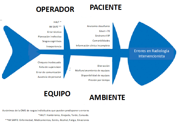 Existen muchos factores sistemáticos e individuales que conducen a errores médicos. Por lo tanto, al considerar el error en RI, un análisis de la causa principal debe tener en cuenta al operador, el paciente, el equipo y el entorno. Se recomienda el uso de sistemas de clasificación de errores, como los creados por la Sociedad de Radiología Intervencionista (por su sigla en inglés, Society of Interventional Radiology – SIR) y la Sociedad de Radiología Intervencionista y Cardiovascular de Europa (por su sigla en inglés, Cardiovascular and Interventional Radiological Society of Europe – CIRSE).
