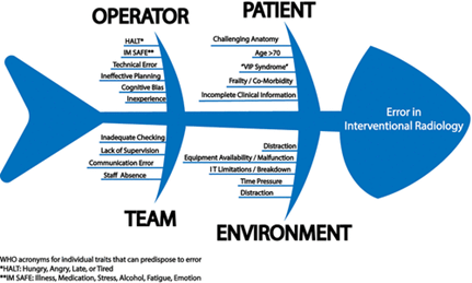 There are many systematic and individual factors leading to medical errors. Therefore, when considering error in IR, a root cause analysis must account for the operator, patient, team, and environment. The use of error classification systems is recommended, such as those created by the Society of Interventional Radiology (SIR) and the Cardiovascular and Interventional Radiological Society of Europe (CIRSE).