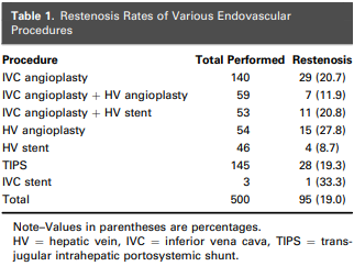 The endovascular procedures analyzed suprahepatic inferior vena cava (IVC) and/or hepatic vein (HV) occlusion with recanalization (angioplasty and/or stent) or transjugular intrahepatic portosystemic shunt (TIPS) creation. Patients were selected through a BCS electronic database from January 2001 to December 2019. To note that for TIPS creation, a modified technique with 2 overlapping stents (1 uncovered and 1 covered) was used because no dedicated TIPS stent was available. The mean follow-up duration was 40.6 months ± 41.9 (median, 28.7 mo; range, 0.5–231 mo).