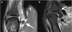 The white arrow in image (a) points to Stener lesion – the dislocated distal stump that is retracted proximally and wrapped around the adductor pollicis aponeurosis (yo-yo on a string appearance). Sagittal image demonstrates concomitant complete disruption of the volar ligaments, the checkrein (black arrow), and phalangoglenoid ligaments (white arrow).
