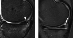 The first image shows far peripheral longitudinal meniscal tear on sagittal T2-weighted fat-suppressed image in an 18 year-old boy with anterior cruciate ligament–deficient knee. The second image shows a normal meniscocapsular junction in a 17 year-old girl. The arrow points towards a normal meniscocapsular recess.