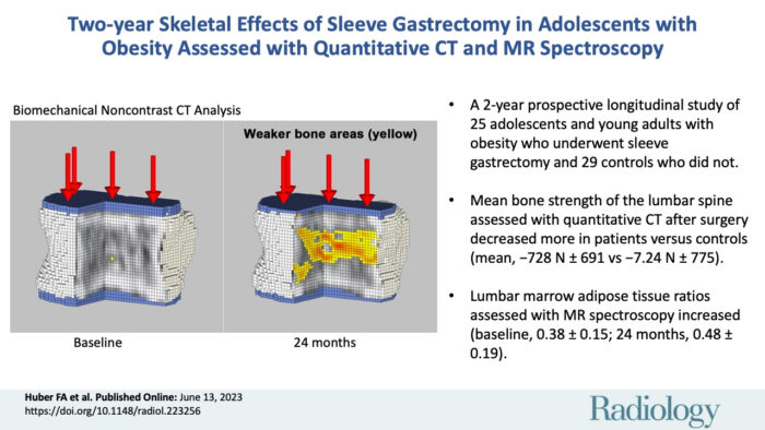 Conclusion: SG in adolescents and young adults reduced vertebral bone strength and density and increased BMAT compared with those in control participants. Adolescents and young adults with obesity had lower bone strength as assessed with quantitative CT and higher bone marrow adipose tissue as assessed with MR spectroscopy 24 months after sleeve gastrectomy compared with control participants who did not undergo surgery.