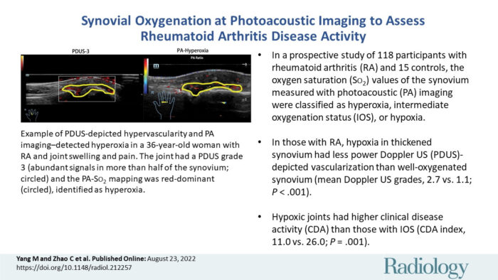 - In this prospective study of 118 participants with rheumatoid arthritis (RA) and 15 control participants, the oxygen saturation values of the synovium measured with photoacoustic imaging were classified as hyperoxia, intermediate oxygenation status, or hypoxia.