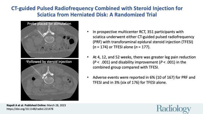 - In a prospective multicenter randomized trial, 351 participants with sciatica underwent either CT-guided pulsed radiofrequency (PRF) combined with transforaminal epidural steroid injection (TFESI) (n = 174) or TFESI alone (n = 177).