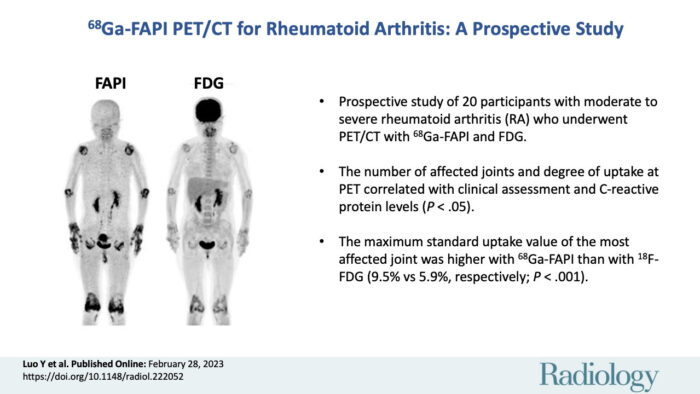 - In RA patients, gallium 68 (68Ga)-labeled fibroblast activation protein inhibitor (FAPI) shows a higher extent of joint involvement, correlates well with clinical and laboratory variables of disease activity, and outperforms fluorine 18 (18F) fluorodeoxyglucose (FDG) PET imaging in terms of showing a greater amount and degree of affected joints.