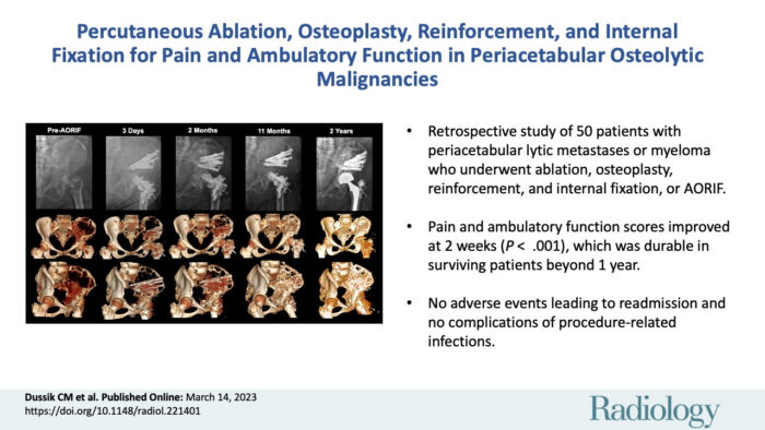 - Percutaneous ablation, osteoplasty, reinforcement, and internal fixation (AORIF) technique can be an effective method for short- and long-term management of pain and improvement of ambulatory function in patients with periacetabular osteolytic neoplasms, with minimal complications. This technique could offer a less invasive alternative to open acetabular reconstructive surgeries, reducing the risk of treatment delays and complications.