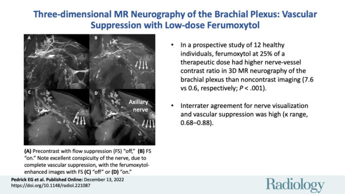 - Ferumoxytol, an ultrasmall superparamagnetic iron oxide particle, can enhance vascular suppression and nerve visualization in the brachial plexus’s three-dimensional (3D) MR neurography.