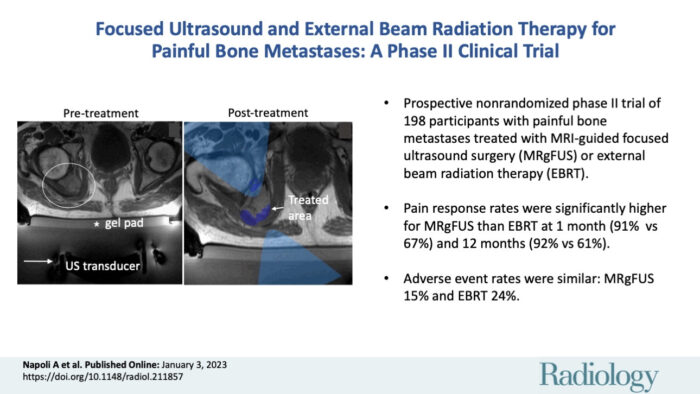 Conclusion: Overall pain response rates assessed with the numeric rating scale were higher for focused ultrasound than for EBRT at 1 month and 12 months. MRI-guided focused ultrasound surgery and external beam radiation therapy showed similar improvements in pain palliation and quality of life, with low adverse event rates.