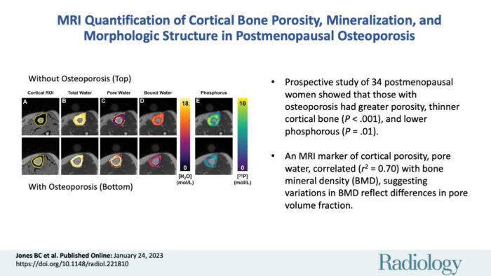 - Using MRI, osteoporotic women showed elevated pore water and total water densities and had lower cortical bone thickness and phosphorus density than non-osteoporotic women.
